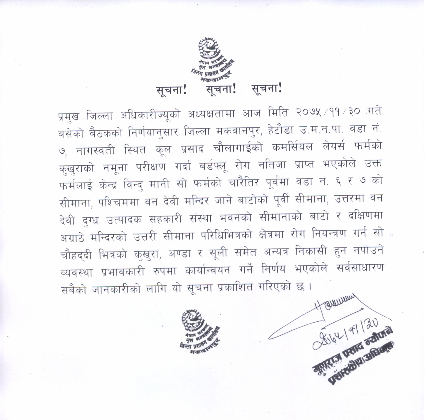मकवानपुर जिल्लाका प्रमुख जिल्ला अधिकारीबाट जारी आदेश ।