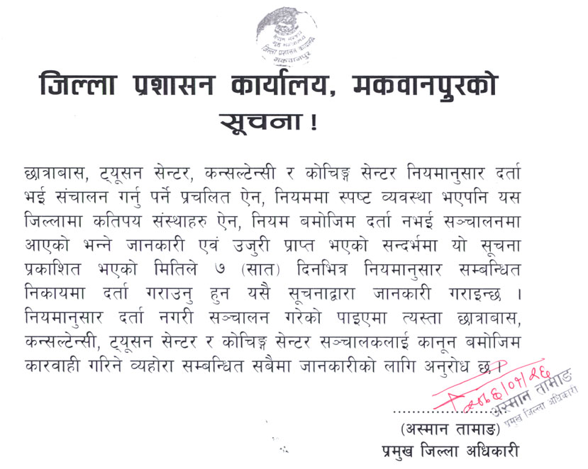 जिल्ला प्रशासन कार्यालय, मकवानपुरको अत्यन्त जरूरी सूचना ।
