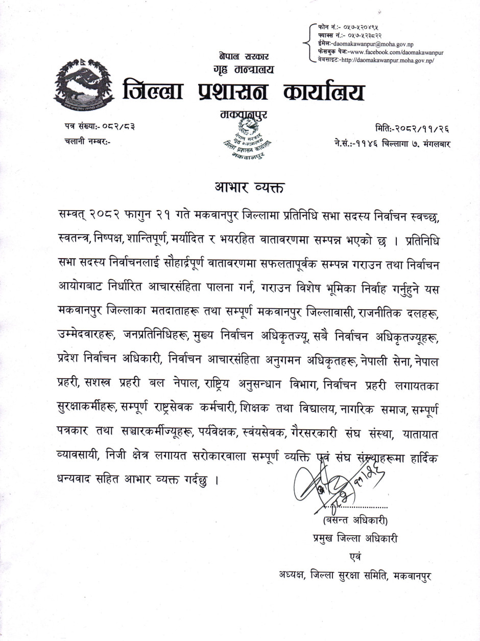 © सर्वाधिकार सुरक्षित जिल्ला प्रशासन कार्यालय, मकवानपुर