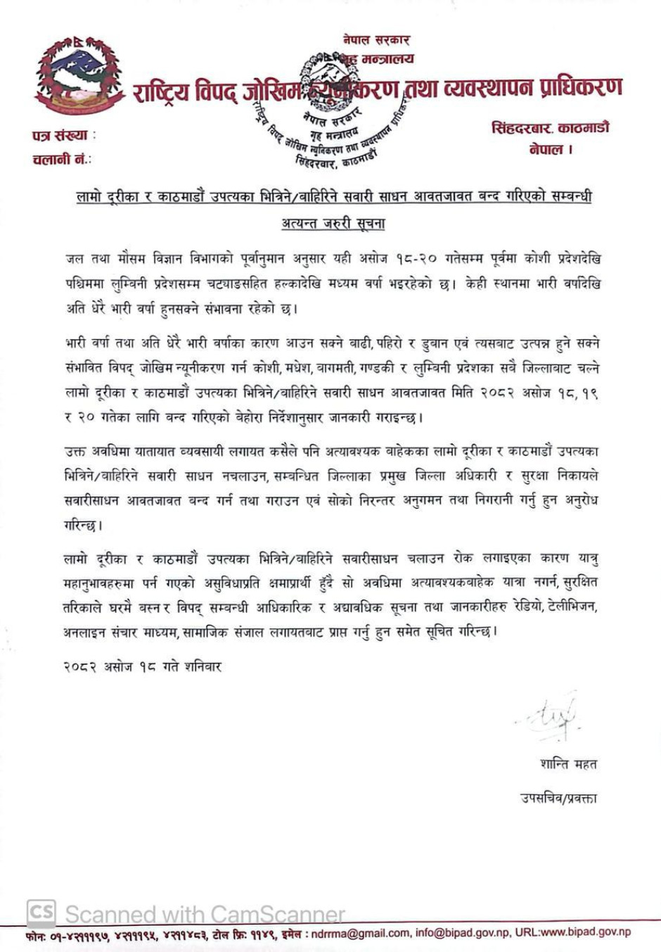 श्री राष्ट्रिय विपद् जोखिम न्यूनीकरण तथा व्यवस्थापन प्राधिकरण, सिंहदरबारको सूचना समेतको आधारमा हेटौडा हुँदै काठमाडौं जाने सबै सडक खण्डहरूमा अत्यावश्यक सेवाका सवारी साधनहरू बाहेक सबै सवारी साधनहरू मिति २०८२ असोज १८, १९ र २० गतेसम्मका लागि आवतजावतमा रोक लगाइएको व्यहोरा सबैमा जानकारीको लागि अनुरोध छ ।