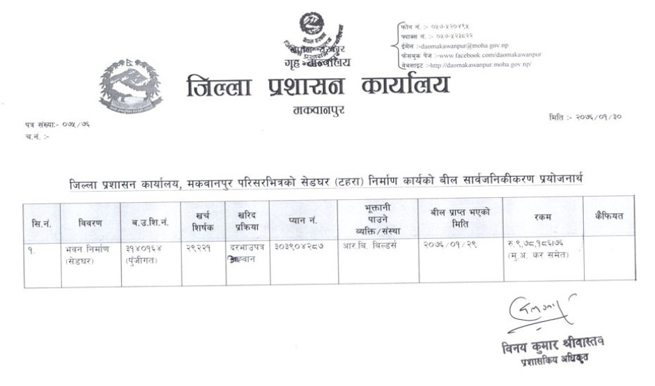 जिल्ला प्रशासन कार्यालय, मकवानपुर परिसरभित्रको सेडघर (टहरा) निर्माण कार्यको बील सार्वजनिकीकरण प्रयोजनार्थ ।