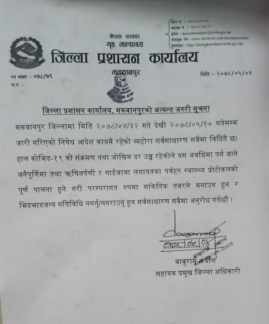 जिल्ला प्रशासन कार्यालय, मकवानपुरको अत्यन्त जरूरी सूचना ।