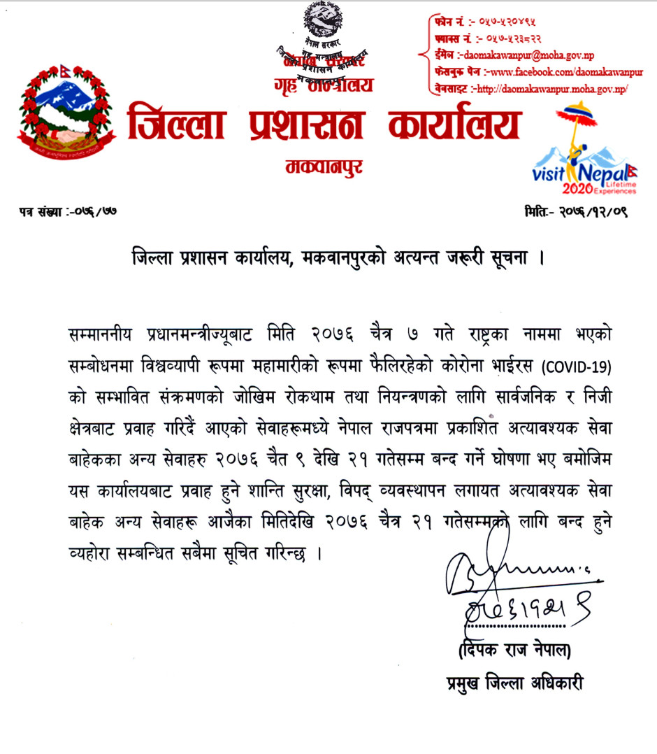 जिल्ला प्रशासन कार्यालय, मकवानपुरको अत्यन्त जरूरी सूचना ।