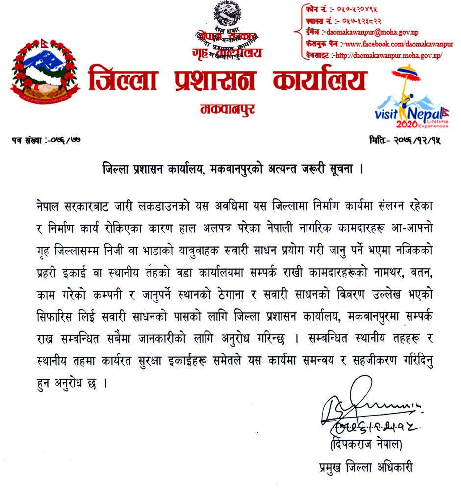 जिल्ला प्रशासन कार्यालय, मकवानपुरको अत्यन्त जरूरी सूचना ।