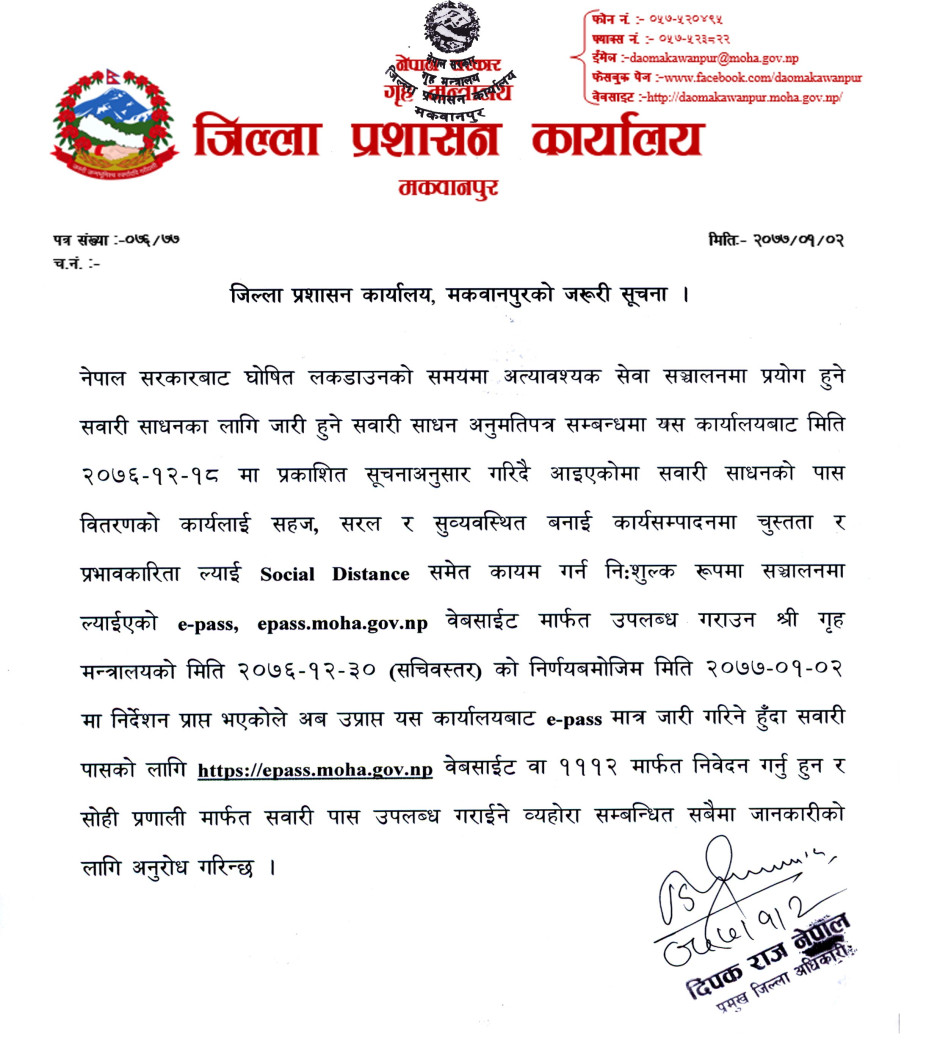 जिल्ला प्रशासन कार्यालय, मकवानपुरको जरूरी सूचना ।