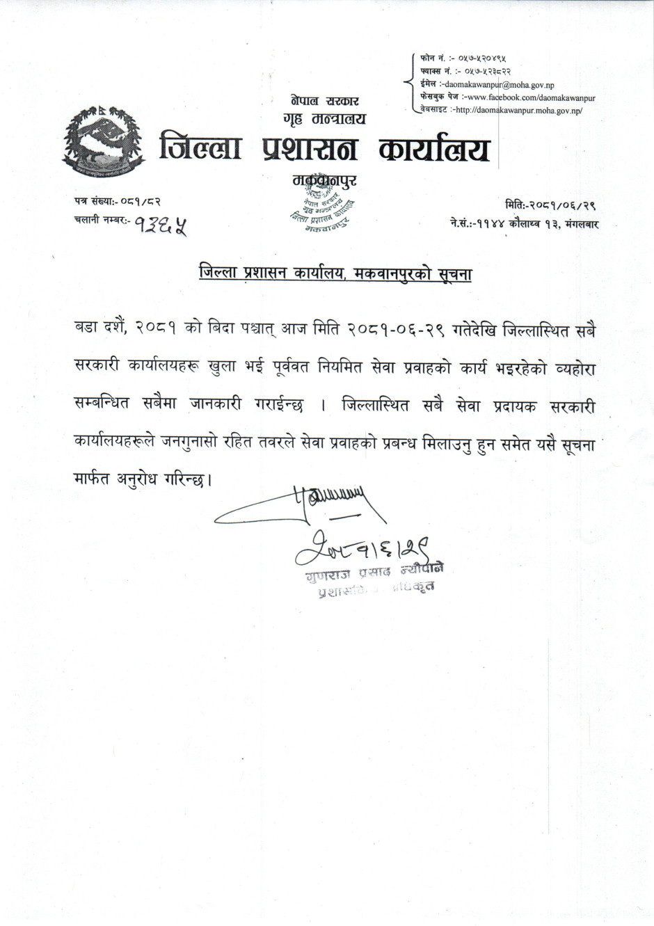 जिल्ला प्रशासन कार्यालय, मकवानपुरको सूचना ।