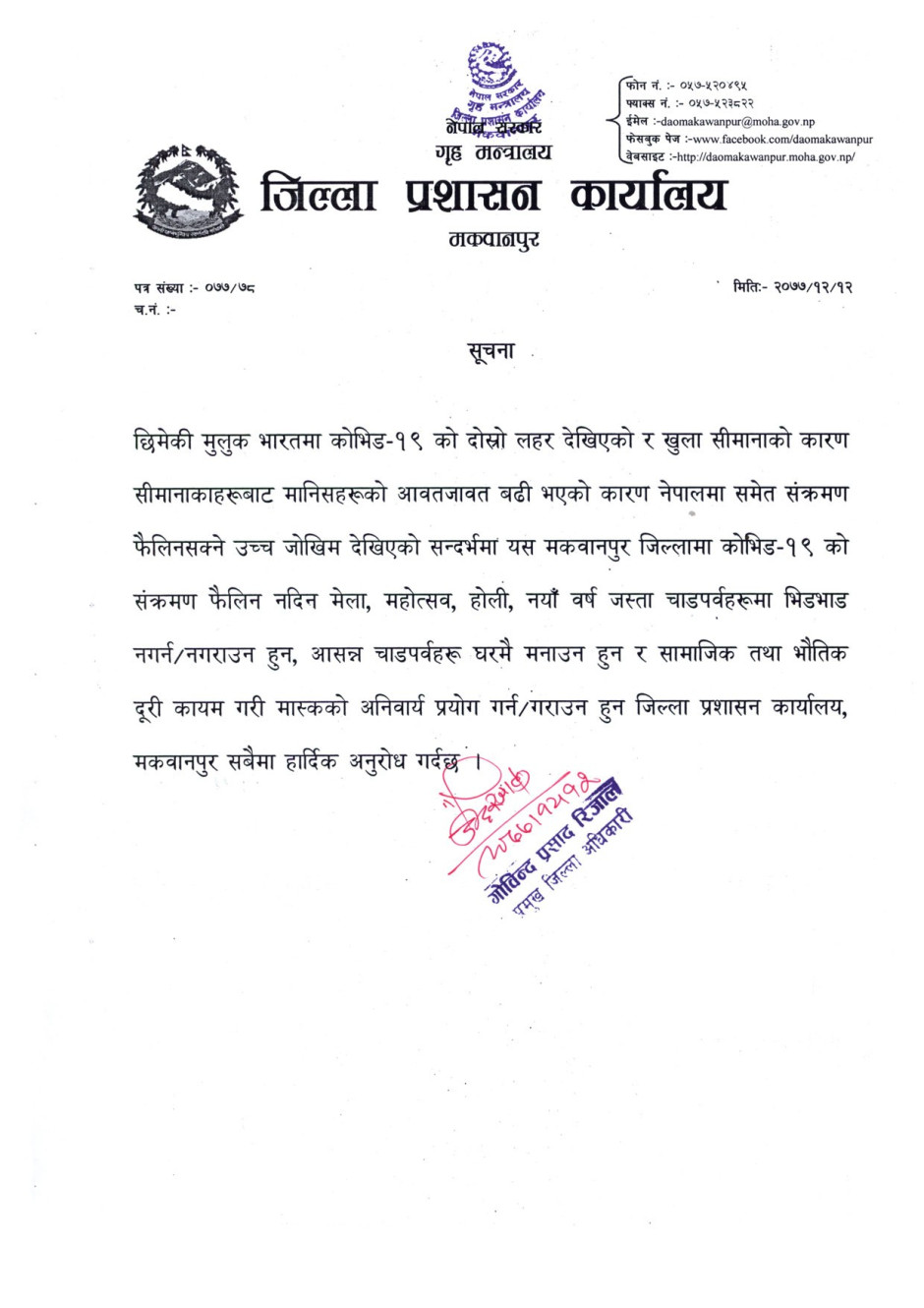 जिल्ला प्रशासन कार्यालय, मकवानपुरको सूचना ।