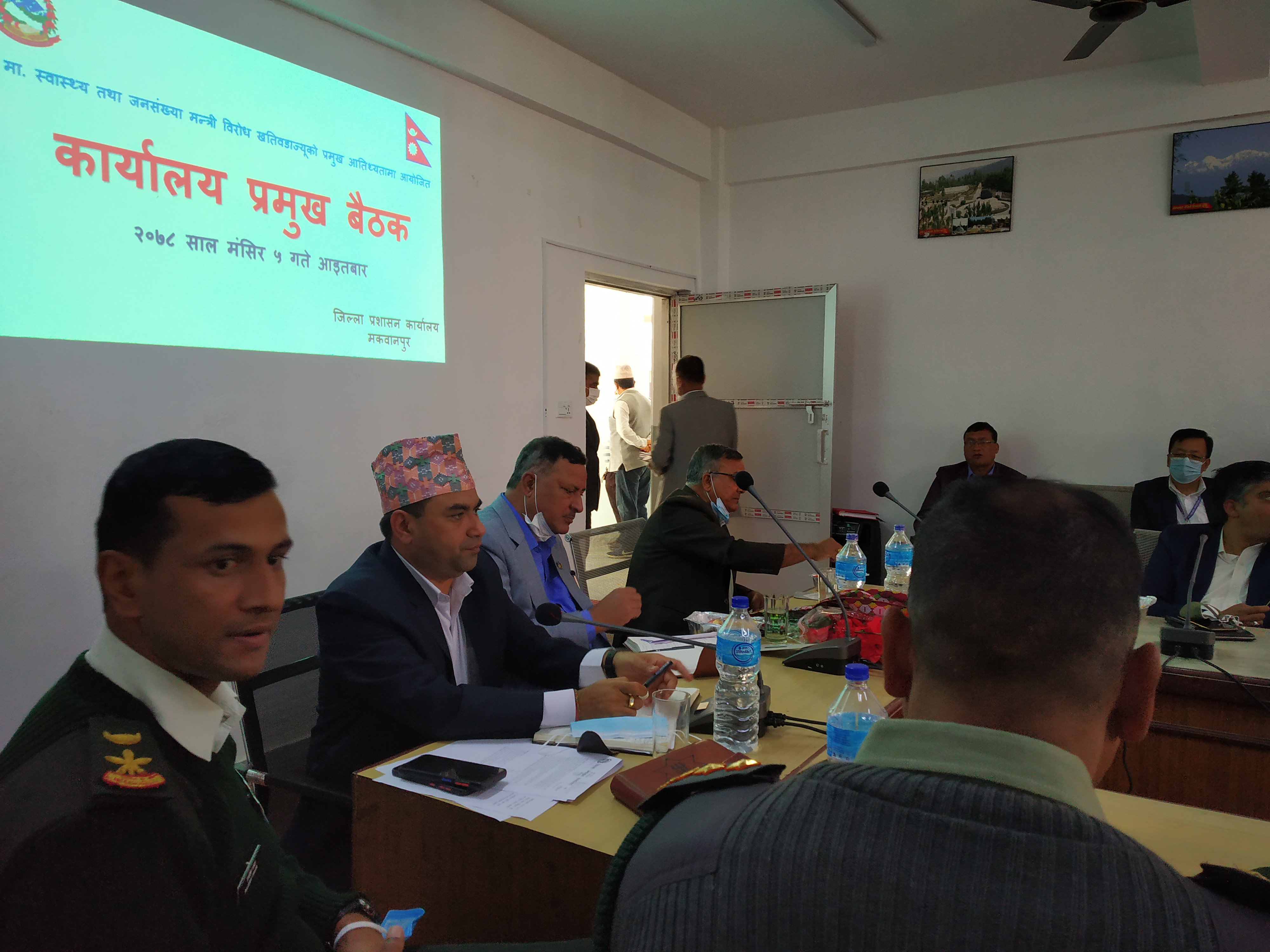 मा. स्वास्थ्य तथा जनसङ्ख्या मन्त्री विरोध खतिवडाज्यूको प्रमुख आतिथ्यतामा मिति २०७८-०८-०५ गते जिल्ला प्रशासन कार्यालय, मकवानपुरमा सम्पन्न कार्यालय प्रमुख बैठक ।