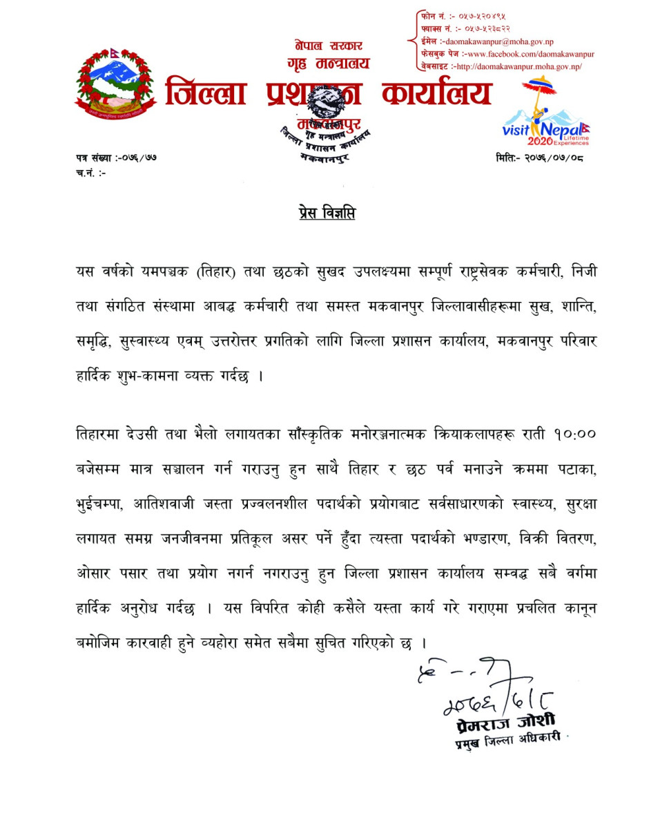 © सर्वाधिकार सुरक्षित जिल्ला प्रशासन कार्यालय, मकवानपुर