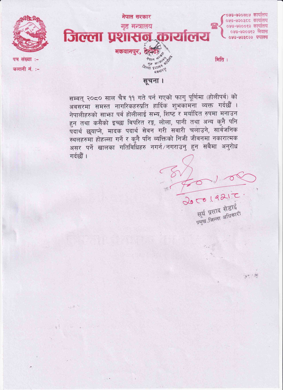 फागु पूर्णिमा (होलीपर्व) सम्बन्धी सूचना