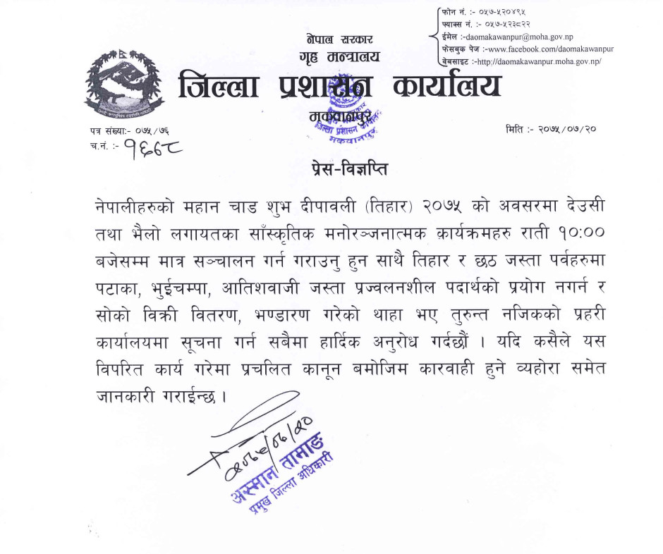 © सर्वाधिकार सुरक्षित जिल्ला प्रशासन कार्यालय, मकवानपुर