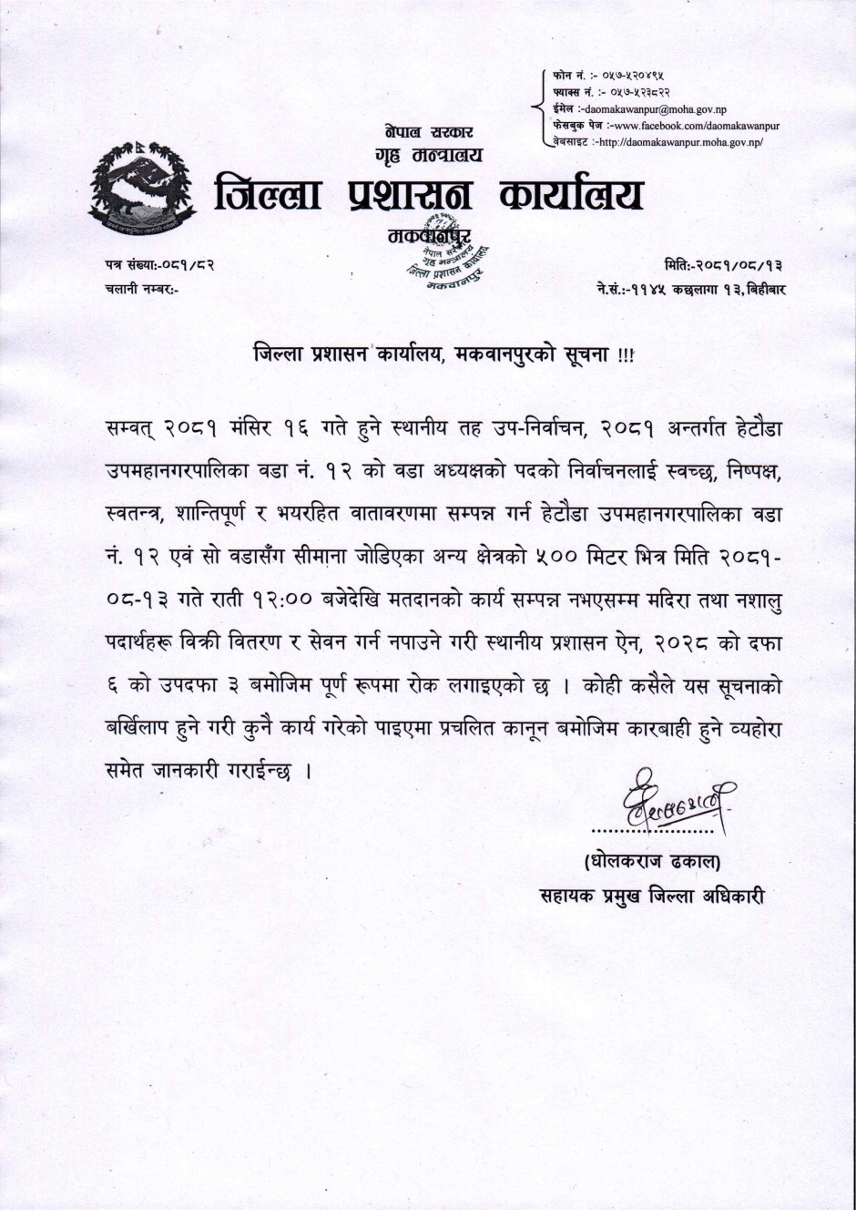© सर्वाधिकार सुरक्षित जिल्ला प्रशासन कार्यालय, मकवानपुर .