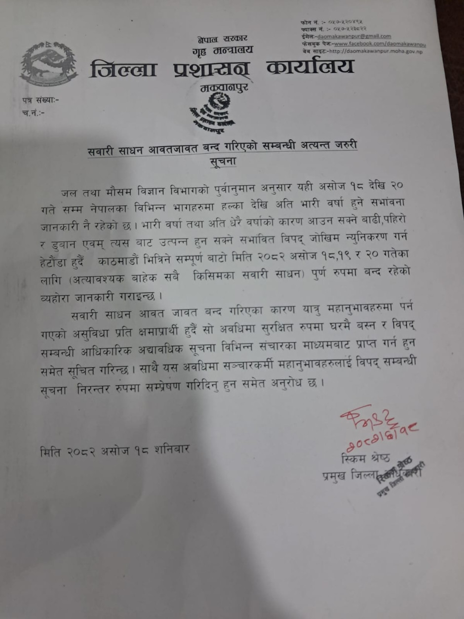 सवारी साधन आवतजावत बन्द गरिएको सम्बन्धी अत्यन्त जरुरी सूचना ।