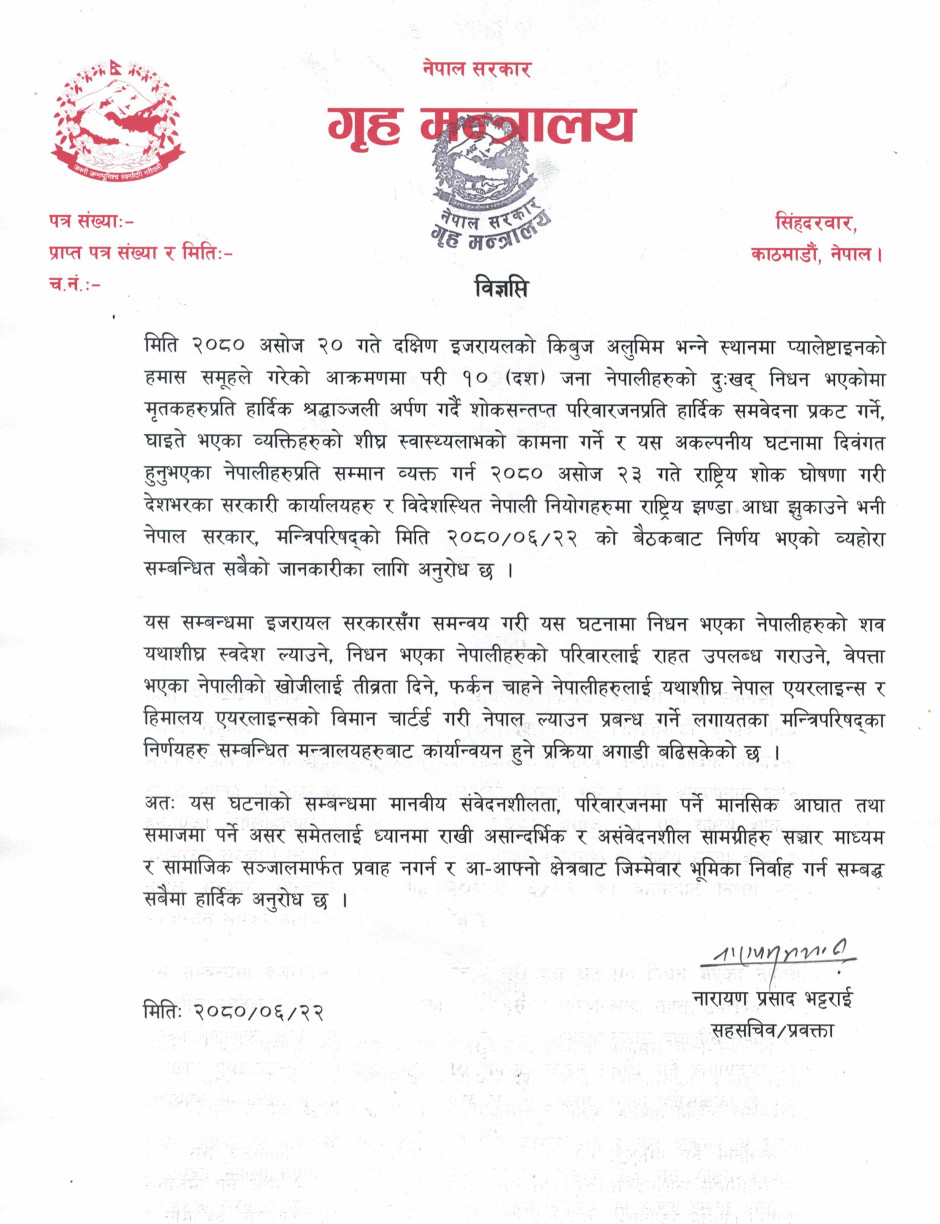 श्री गृह मन्त्रालयद्वारा मिति २०८०-०६-२२ मा जारी विज्ञप्ति ।