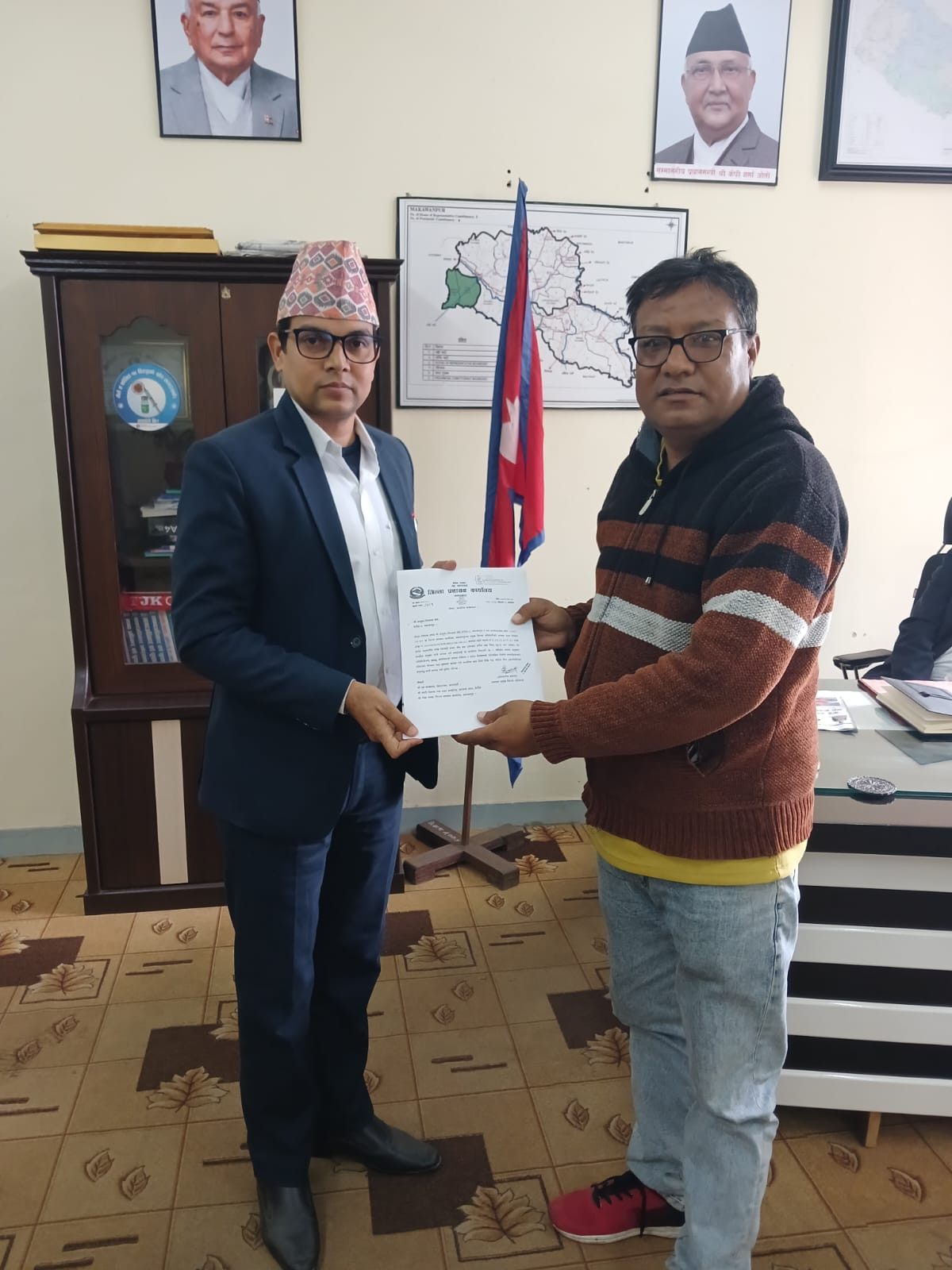 श्रीमान् प्रमुख जिल्ला अधिकारी र नेपाल पत्रकार महासंघ मकवानपुर शाखाको नवनिर्वाचित पदाधिकारीहरूबीच आज मिति २०८१-१०-०७ गते जिल्ला प्रशासन कार्यालय, मकवानपुरमा सम्पन्न परिचयात्मक तथा छलफल कार्यक्रम ।