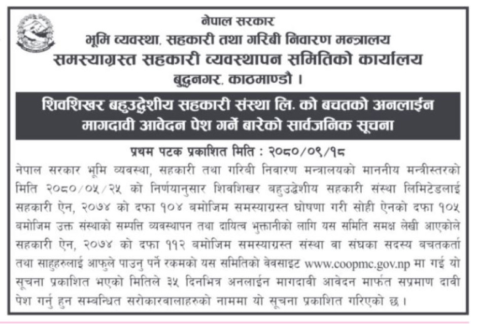 शिवशिखर बहुउद्देशीय सहकारी संस्था लि. को बचतको अनलाईन मागदावी आवेदन पेश गर्ने बारेको सार्वजनिक सूचना ।
