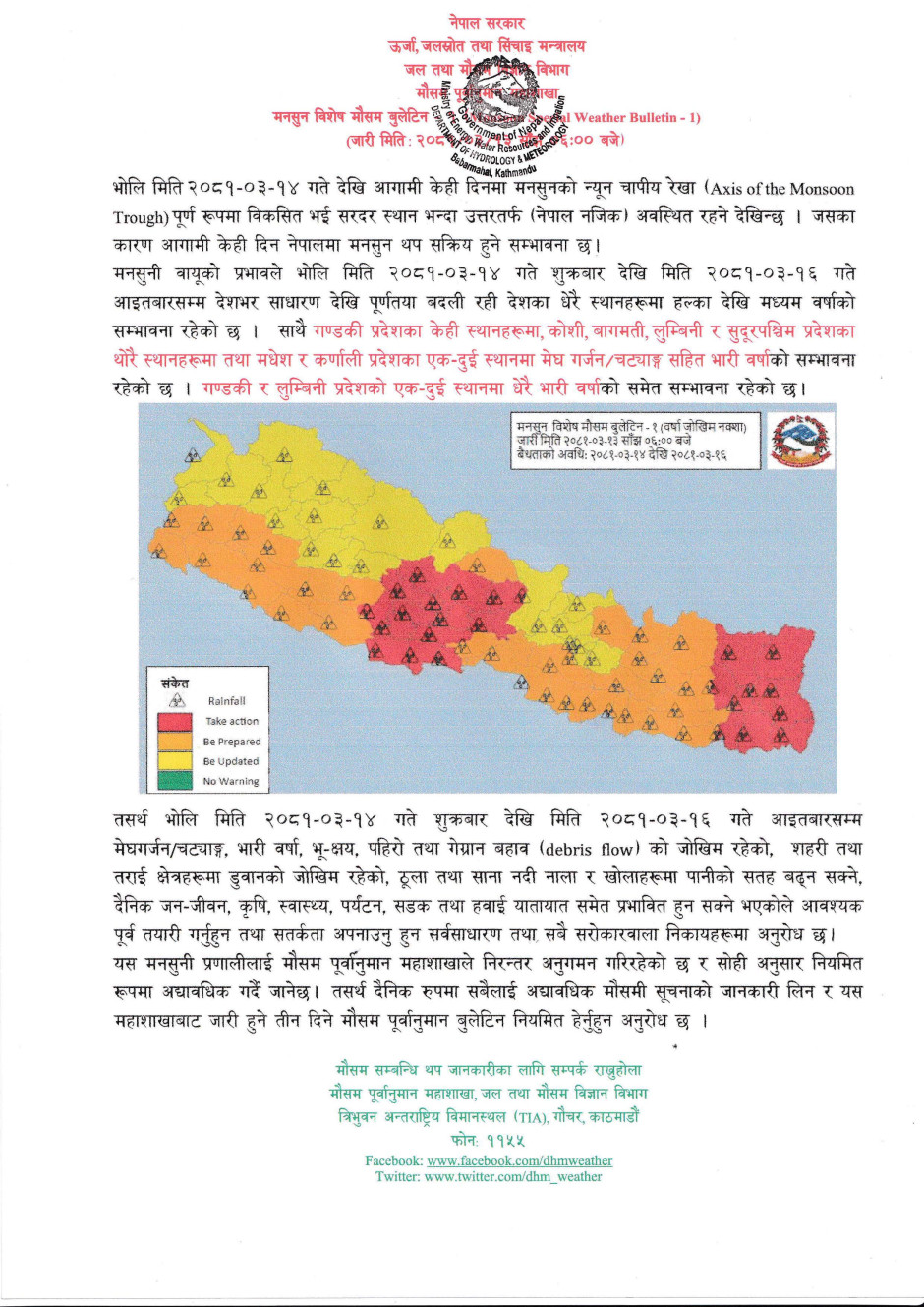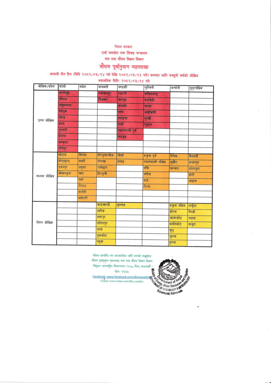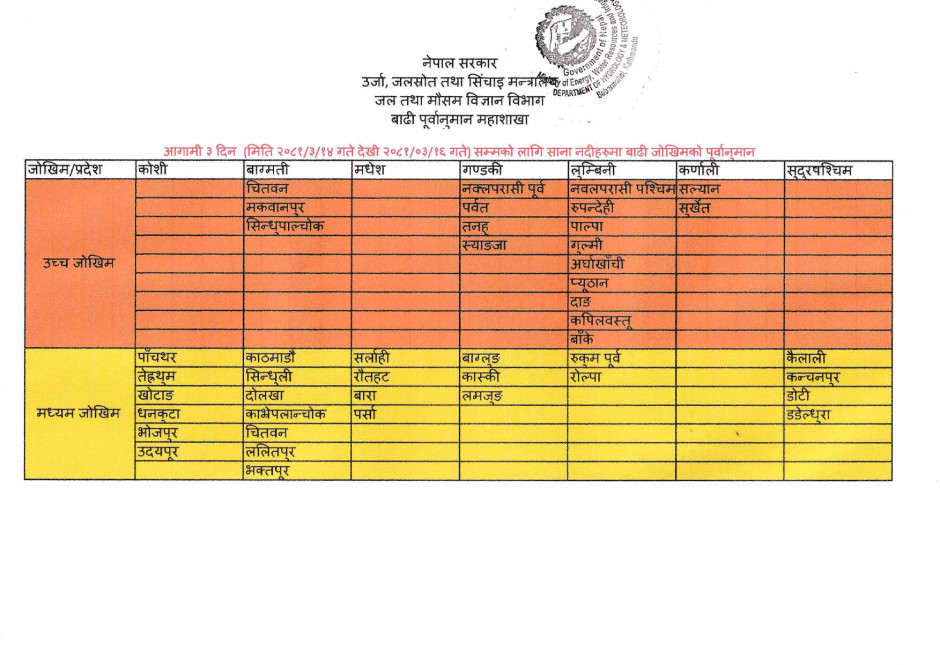 जल तथा मौसम विज्ञान विभाग, मौसम पूर्वानुमान महाशाखाका अनुसार आज राति, भोलि र पर्सिसम्म संलग्न तालिकाहरुमा दिइएअनुसारका जिल्लाहरुमा मनुसनी वर्षाको उच्च जोखिम, मध्यम जोखिम र जोखिम एवं साना नदीहरुमा बाढीको उच्च र मध्यम जोखिम रहेकोले सोहीअनुसार सावधानी अपनाउन एवम् पूर्वतयारीमा जुट्न सम्बन्धित सम्पूर्ण निकायमा अनुरोध गर्दछौं ।