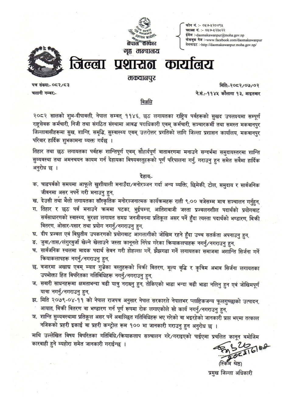 © सर्वाधिकार सुरक्षित जिल्ला प्रशासन कार्यालय, मकवानपुर